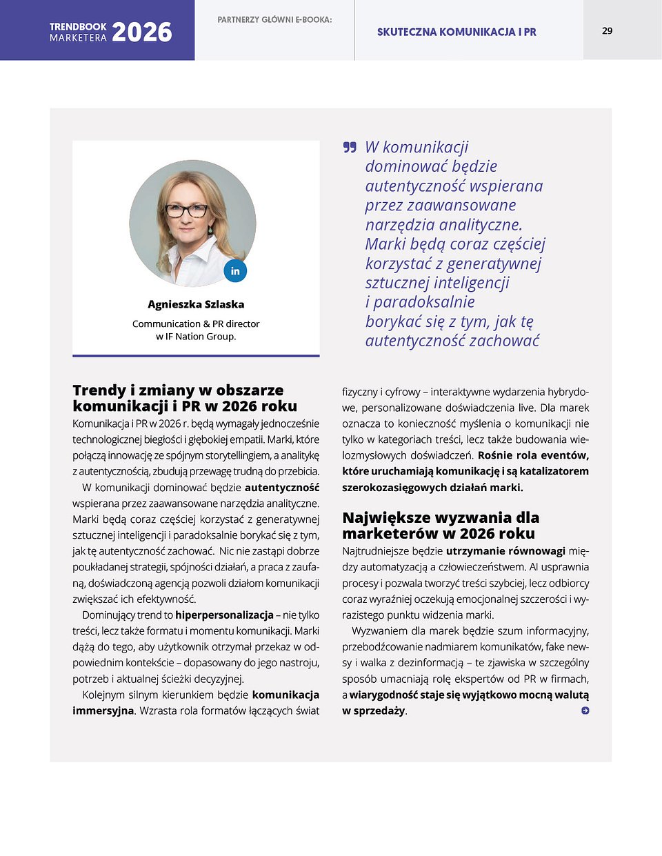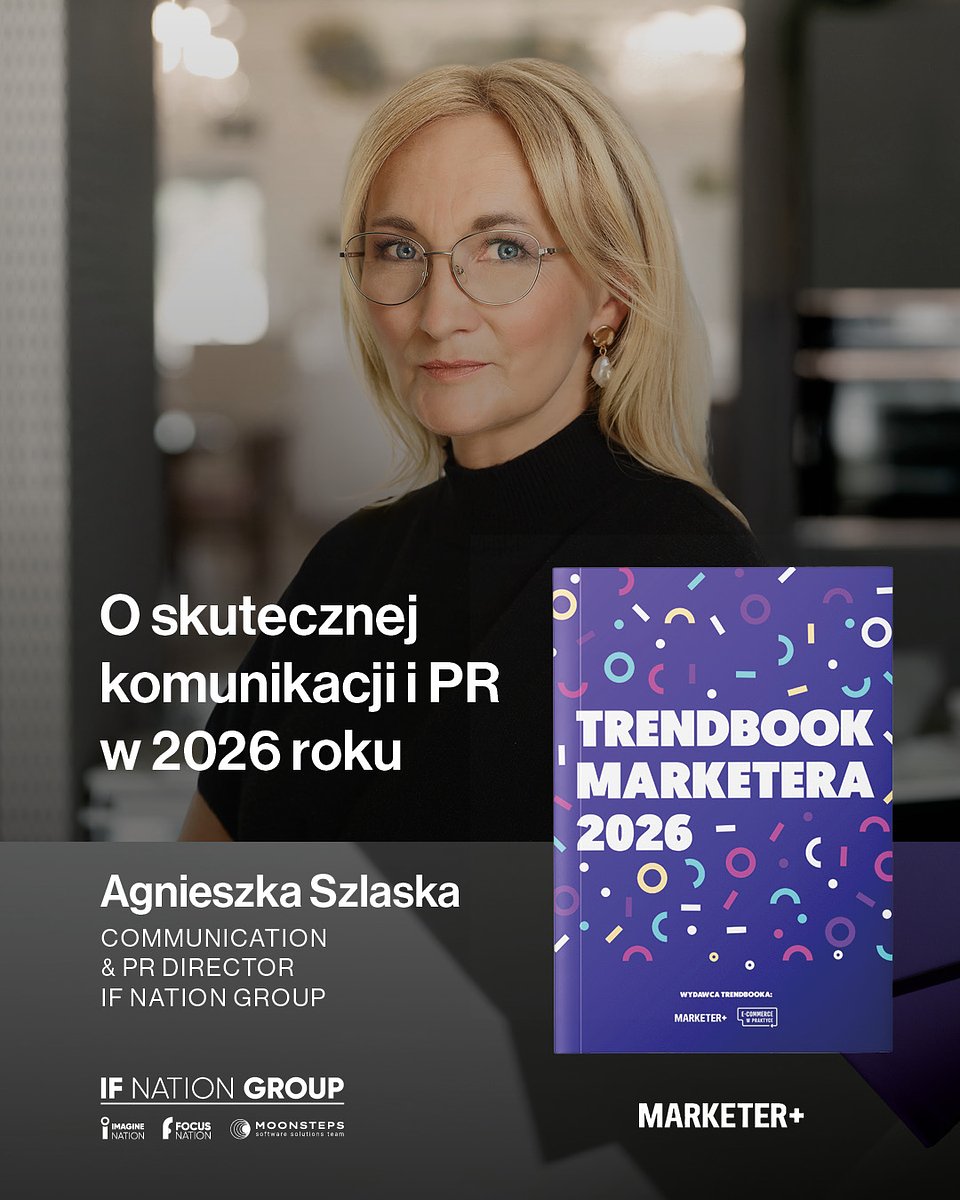 Jeżeli w tym roku macie czas, żeby przeczytać jeden Trendbook, to polecamy Wam gorąco ten od magazynu Marketer+. Agnieszka Szlaska, Communication & PR Director IF NATION GROUP na zaproszenie redakcji podzieliła się w nim swoją wiedzą oraz opinią na temat "Komunikacji i PR" w 2026 roku.