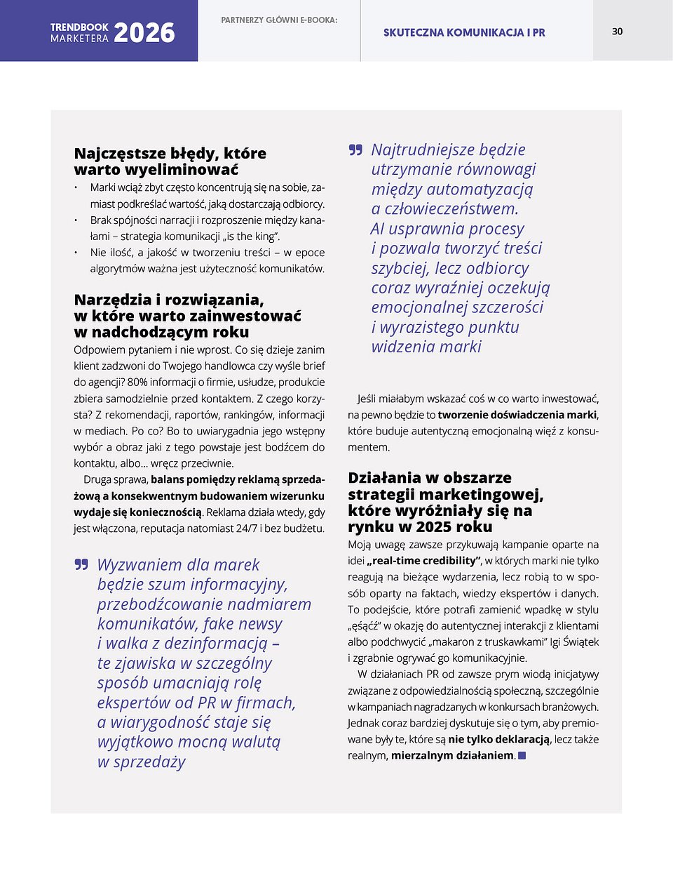Wyzwaniem dla marek będzie szum informacyjny, przebodźcowanie nadmiarem komunikatów, fake newsy i walka z dezinformacją – te zjawiska w szczególny sposób umacniają rolę ekspertów od PR w firmach, a wiarygodność staje się wyjątkowo mocną walutą w sprzedaży.